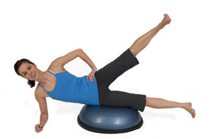 - Place your hip on the center of the BOSU and your elbow on the floor in line with your shoulder. Place opposite hand on hip (or on the BOSU in front of your hips if you need extra balance). Tighten your abs and keep them activated throughout the exercise.
