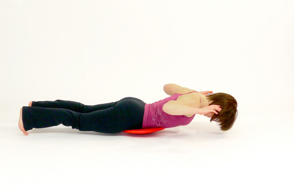 - Lie with your stomach on the balance board and your toes on the floor. Bring your hand up over your head - your head should not be touching the floor. Keep your belly button pulled in at all times.