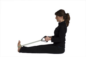 - Empieza de pie con los pies separados la anchura de los hombros. Los brazos deben estar a la altura de los hombros y doblados formando un ángulo de 90 grados. Sujeta cada extremo de la banda en las manos, quedando la banda justo por detrás de la cabeza.